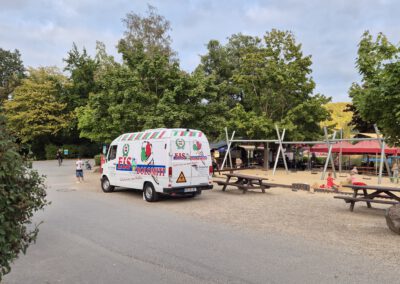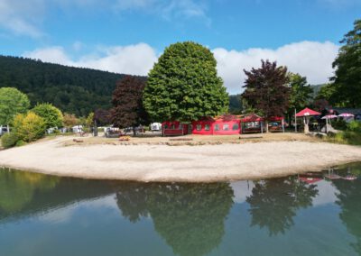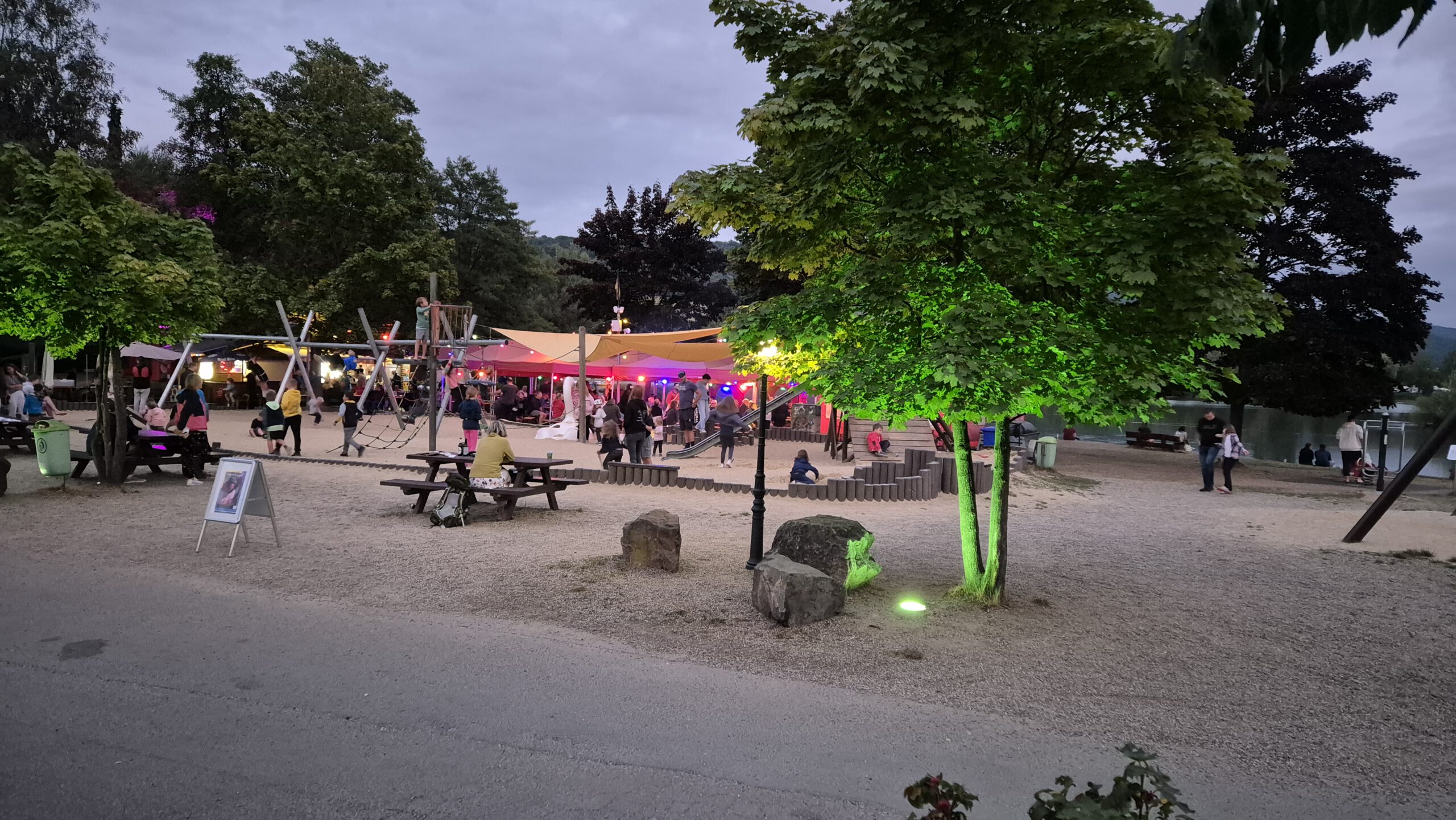 Direkter Blick zum See, vor uns der große Kinderspielplatz und das Veranstaltungszelt mit Strandhütte, neben uns die Imbissbude, der mobile Eiswagen und auch die mobile Kirche.