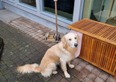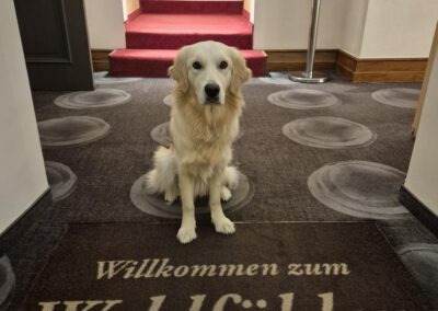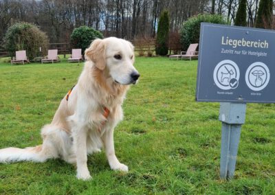 Das während unseres Besuchs ständige Schwanzwedeln von Fina ist schnell erklärt. Fina hat sich nicht nur über die sehr aufgeschlossene Hoteldirektorin gefreut, die mit ihrer lieben Labrador-Hündin „Paula“ Spielrunden ermöglichte, sie freute sich nicht nur über so einige Leckerlis von herzlichen Mitarbeitern, sondern auch total darüber, dass sie aus dem Hotel heraus sofort in die weitläufige Natur springen konnte.