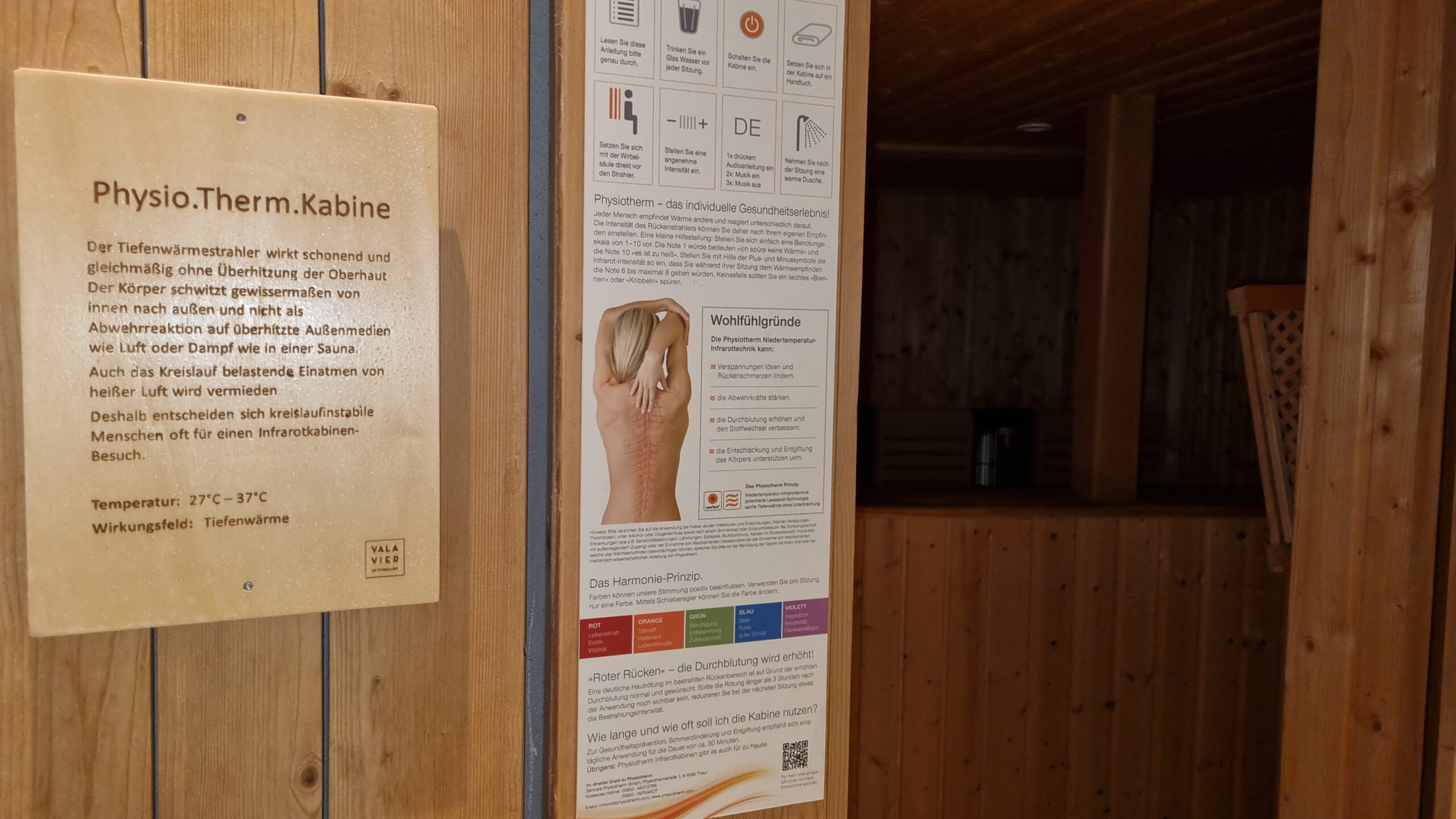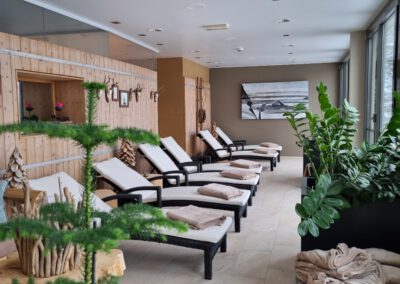 - Wellnessbereich: Bio-Sauna, Finnische Sauna, Zirbel-Sauna, Dampfbad, Infrarotkabine, Meeresklima-Kabine, Ruheräume, Teestation u.a.