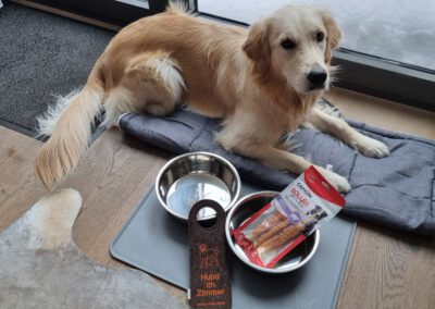 Genauso herzlich wie Kay wurde auch Fina empfangen und auf dem Zimmer wartete schon ein schönes Hundetreatment. Fina durfte fast überall mit hin, außer natürlich in den Wellnessbereich. Im Restaurant gibt es einen Bereich für Hotelgäste mit Hund, der war aber mittendrin im Leben und sehr gemütllich.