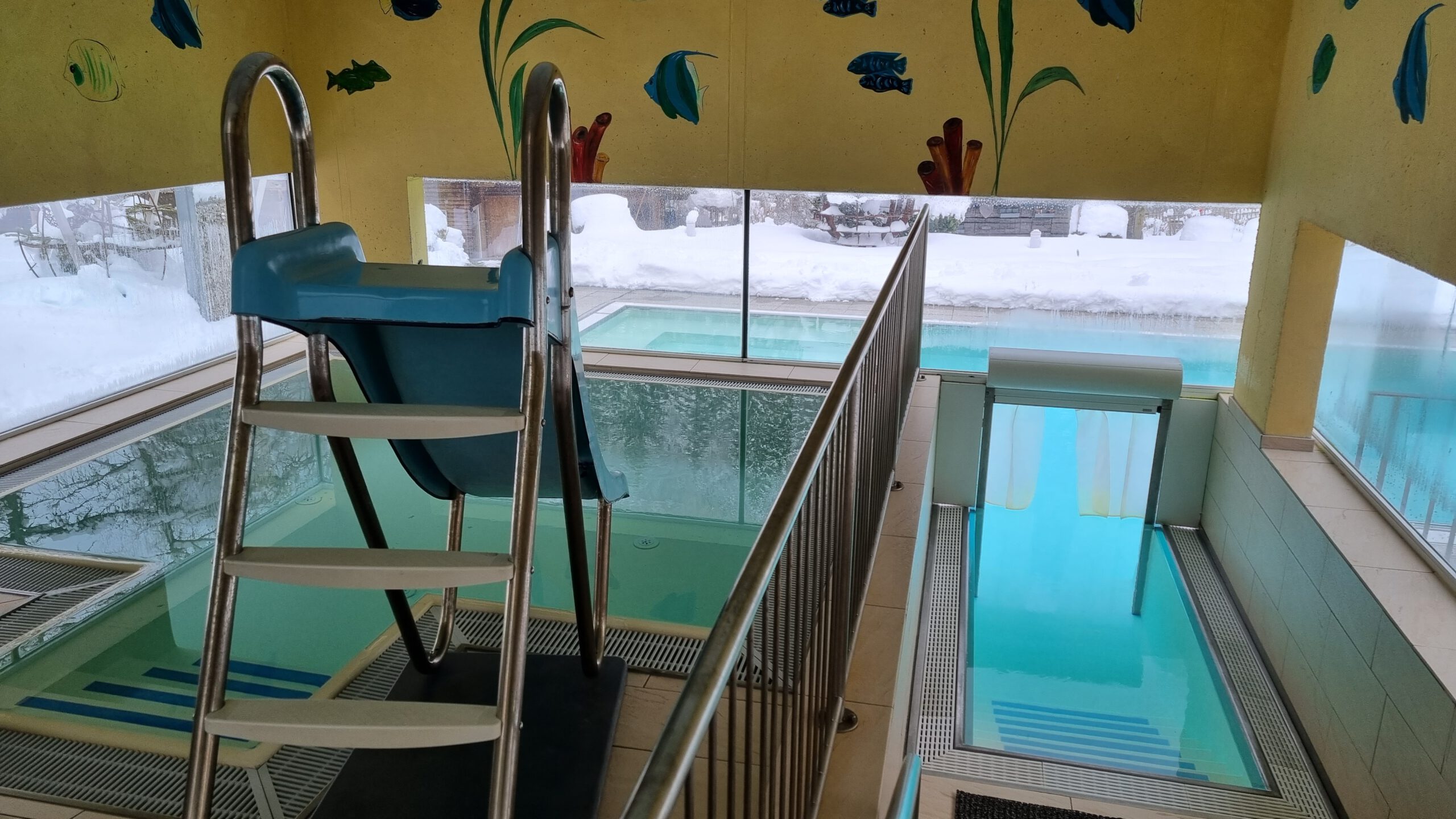 Das kleine Kinderbecken ist im warmen Häuschen, der Zugang zum Außenpool ist schnell durchschwommen.