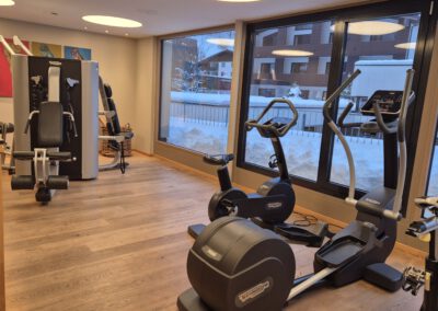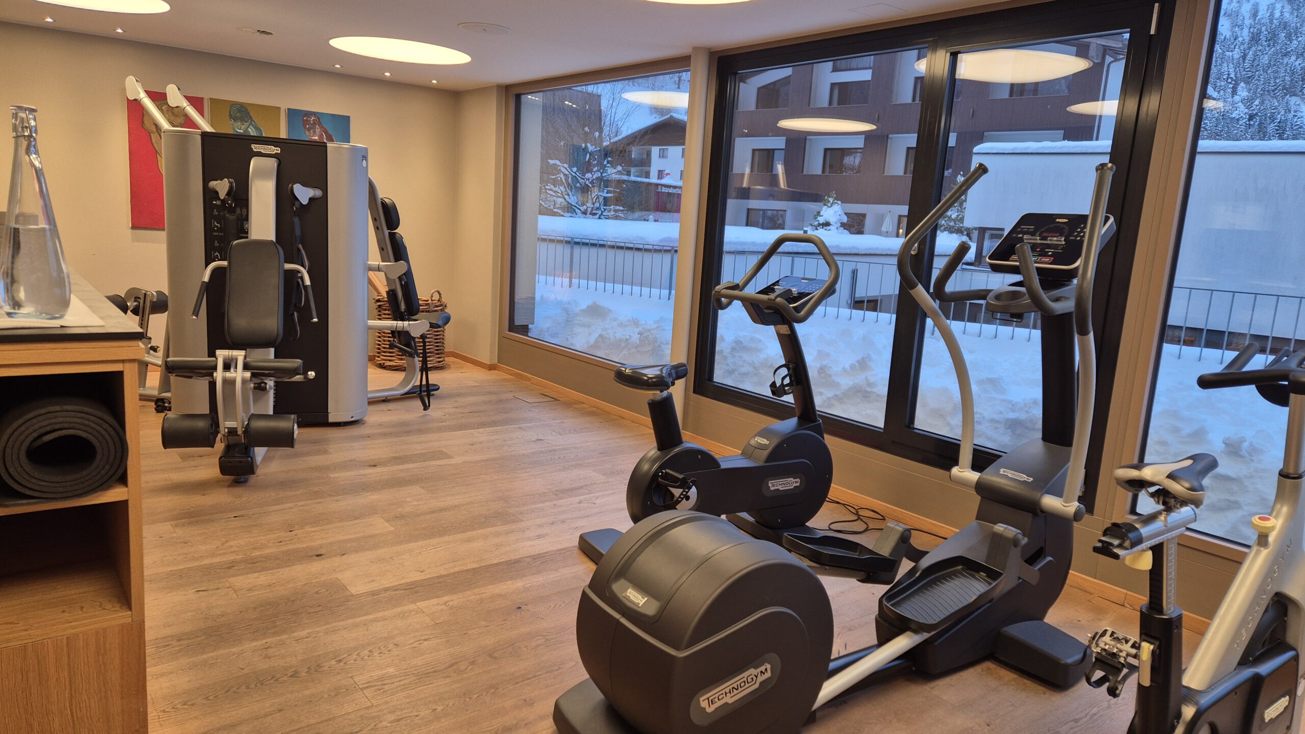 In einem kleinen Fitnessraum kann man Ausdauer- und Krafttraining betreiben, Blick in die Berge inklusive.