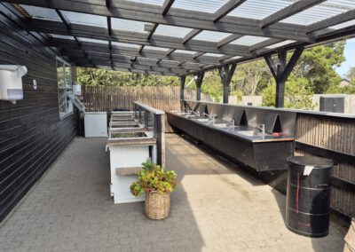 Zu den sehr sauberen Sanitärgebäuden mit Innen- und Außenküchen ist der Weg jeweils nicht weit.