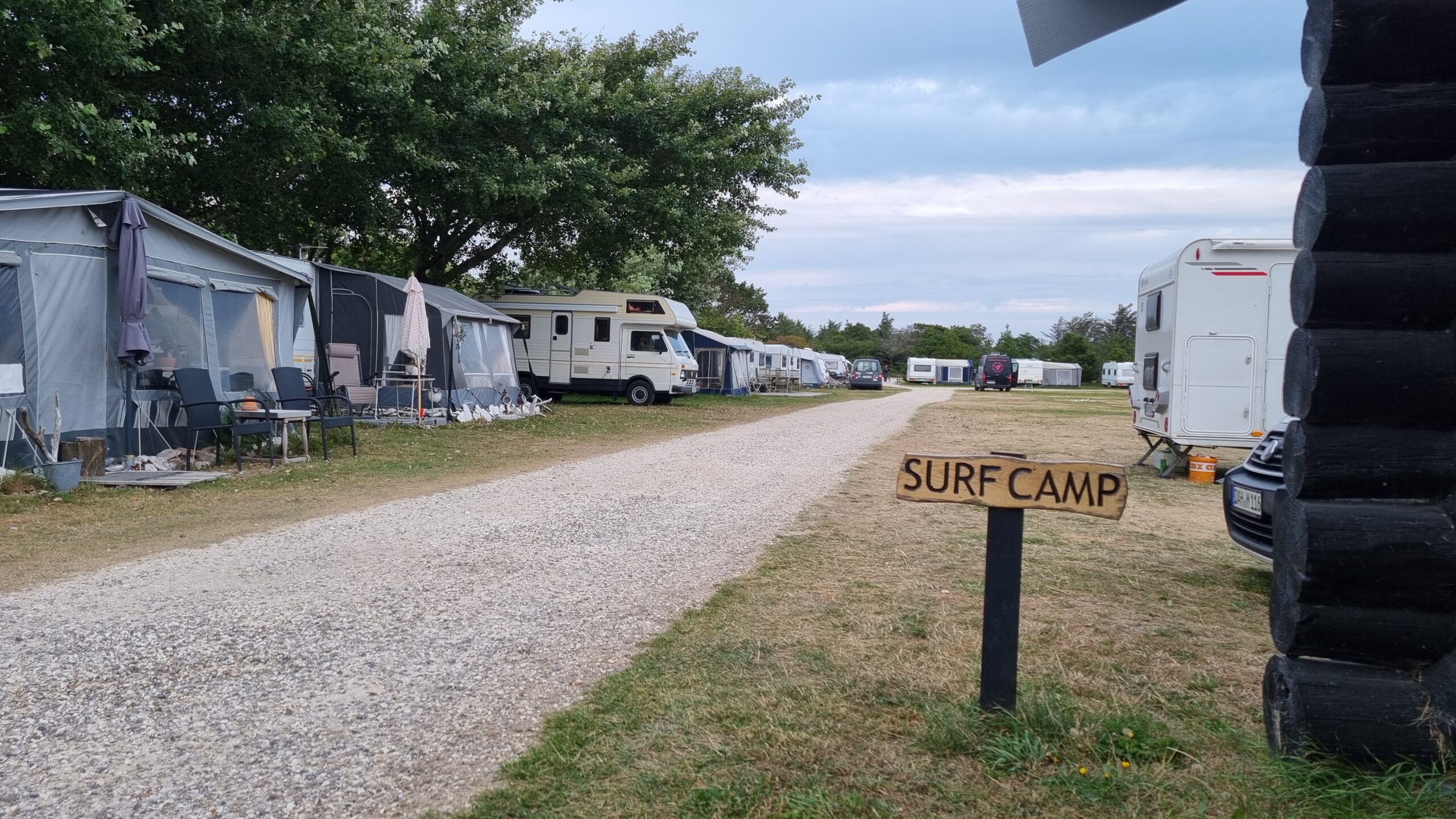 Es gibt eine sehr große Wiese, auf der alle offen mit ihren Wohnmobilen, Zelten und Wohnwagen nebeneinander campen.